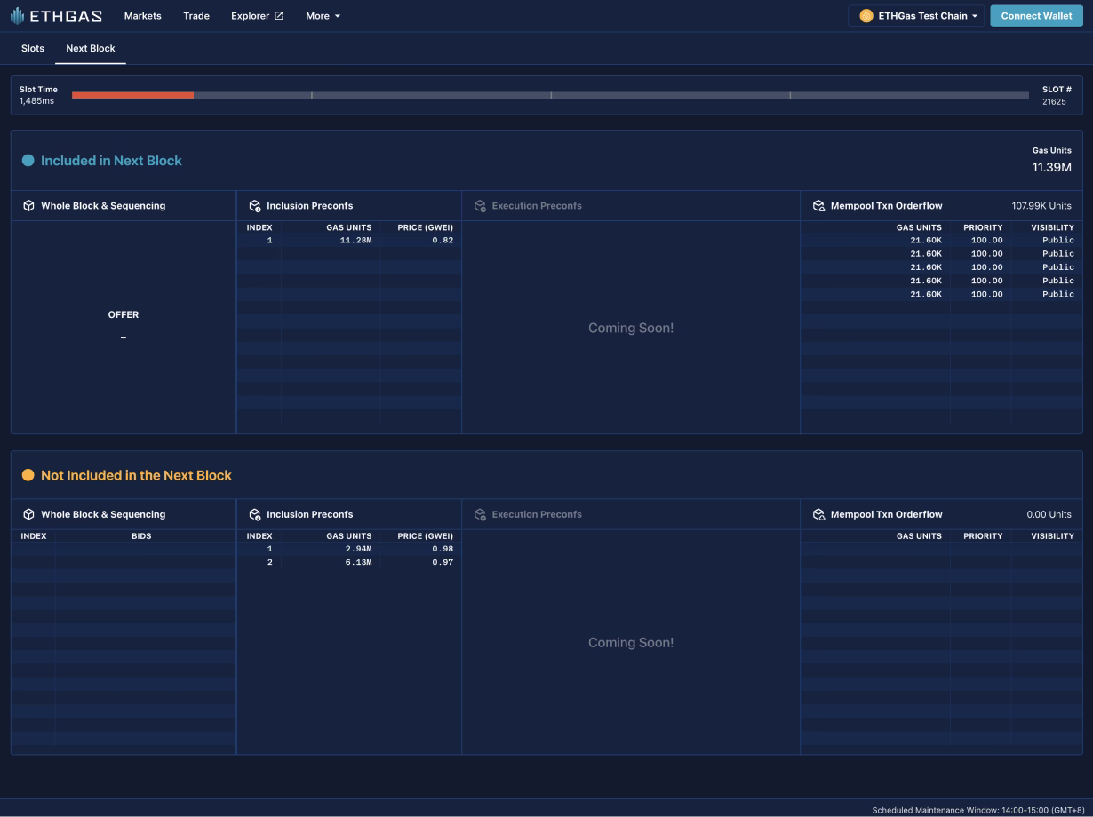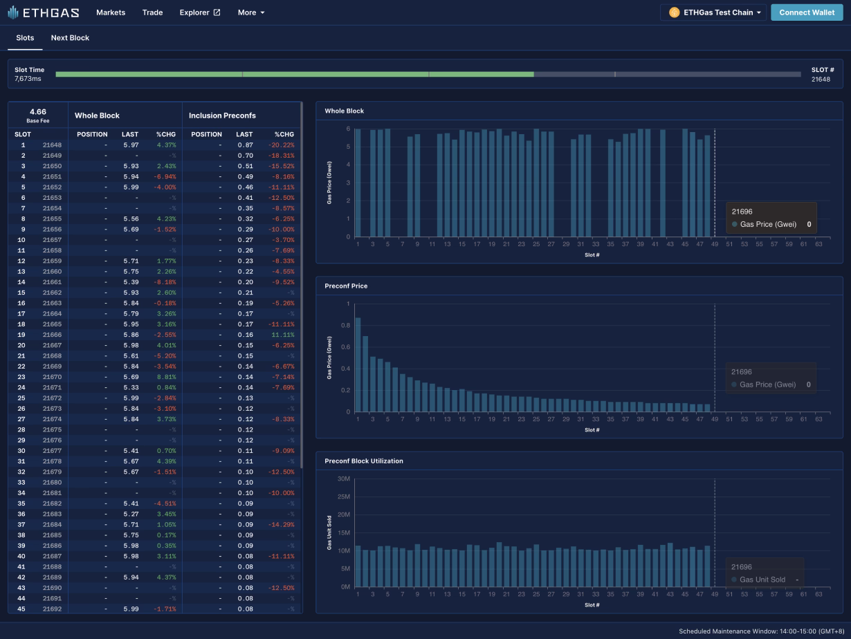 ETHGas is a marketplace for Ethereum blockspace commitments. We aim to transform how users interact with Ethereum by enabling low-latency, 3ms settlement times and real-time trading, alongside our comprehensive product suite for precise order execution.